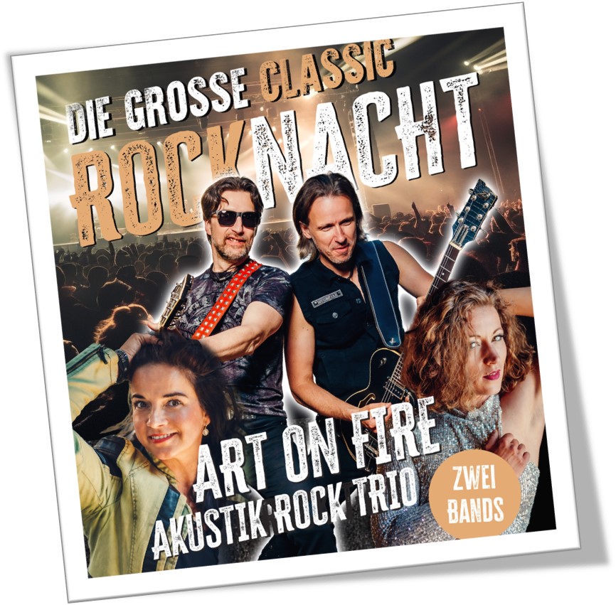 Zwei Bands, zwei großartige Sängerinnen, ein epischer Abend!Wenn ART ON FIRE und das Akustik Rock Trio gemeinsam die Bühne erobern, wird der Club zur Zeitmaschine in die goldene Ära des Rock. Mit Songs von Led Zeppelin, Deep Purple, AC/DC, Janis Joplin, Whitesnake und vielen weiteren Rock-Legenden erwartet Euch eine Nacht voller Gitarrenriffs, Groove und purer Energie.
